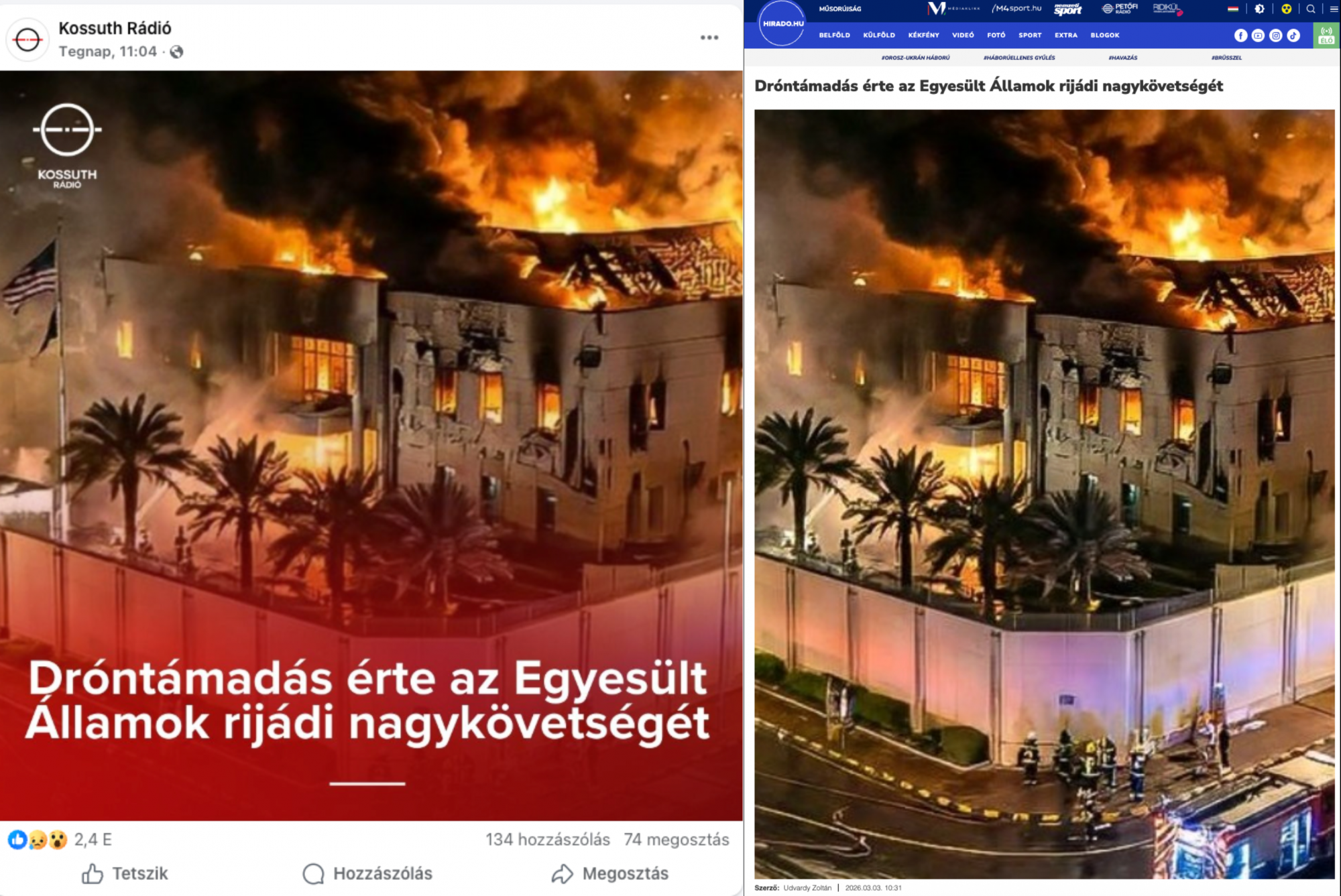 A köztévé online hírportálja (archív) a hirado.hu és az állami Kossuth Rádió Facebook oldala is megosztott egy képet egy lángokban álló impozáns saroképületről. A képet ahhoz az eseményhez társították, hogy dróntámadás érte az Egyesült Államok rijádi nagykövetségét.