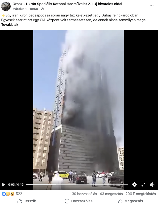 „Egy iráni drón becsapódása során nagy tűz keletkezett egy dubaji felhőkarcolóban. Egyesek szerint ott egy CIA központ volt természetesen, de ennek nincs semmilyen megerősítése.”