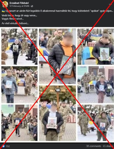 „Ugyanazt az ukrán fiút legalább 8 alkalommal használták fel, hogy különböző "apákat" gyászoljon... Vedd észre, hogy át vagy verve... Vagyis filmet nézel...” – olvasható egy magyar Facebook-bejegyzésben, amit 2026. február 12-e óta már 65 alkalommal osztottak meg. A bejegyzéshez egy fotómontázst is mellékeltek, amelyen ugyanaz a tinédzser fiú látható nyolc különböző temetésen az elhunyt portréjával a kezében.