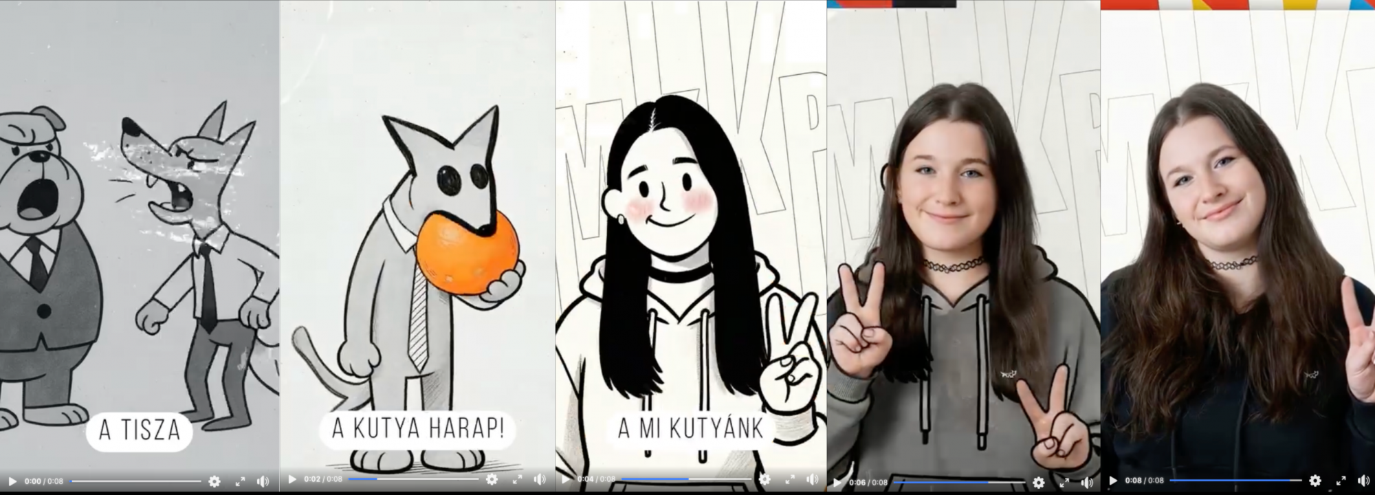 Egy esetben magát a profilt hirdették, hat hirdetésváltozatban pedig egy rajzfilmszerű, AI-generált kisfilmet, ami az MKKP jelöltjét szerepelteti. A videó azzal a kijelentéssel kezdődik, hogy „a Tisza ugat, a kutya harap”, majd megjelenik rajzolt formában az MKKP Pest megye 5-ös számú egyéni választókerületében induló jelöltje, Ádám Emese. A kísérőszöveg: