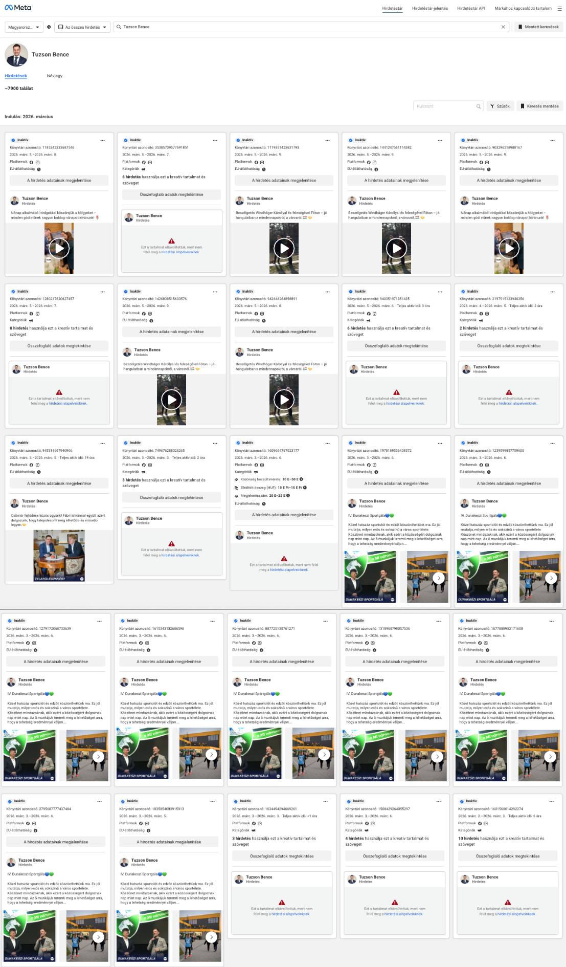 Tuzson Bence hivatalos Facebook-oldala tömegesen adja fel a reklámokat: csak március első nyolc napjában 56 hirdetést indított nyolc különböző vizuális tartalomra a Meta hirdetéstára szerint Facebook- és Instagram-felhasználókat célozva.