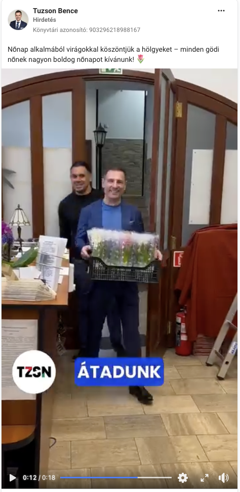 Így annak a 44 ezer felhasználóhoz eljutott videónak a hirdetési adatainak sem minden része nyilvános, amelyben Tuzson Bence nőnap alkalmából virágot oszt.
