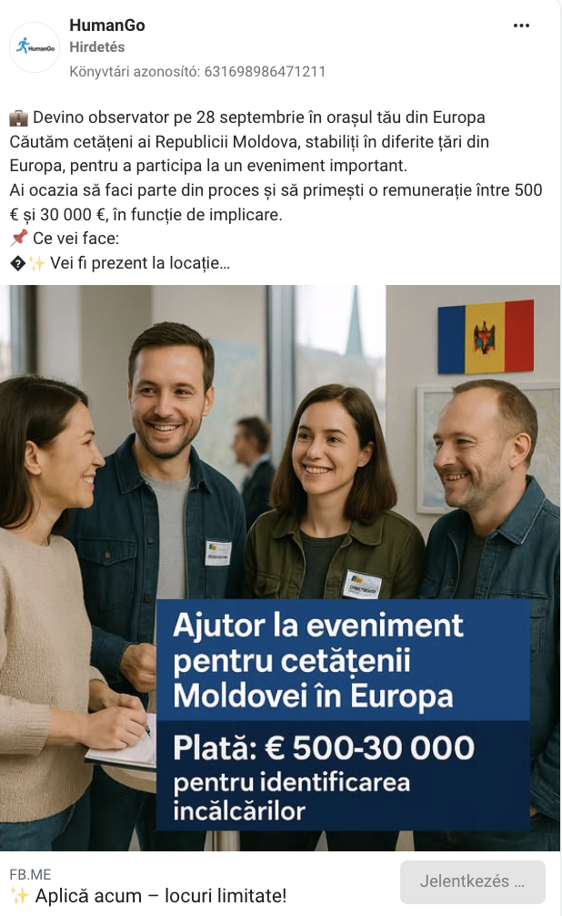 A Lumen Personal nevű, Lengyelországból üzemeltetett oldal adta fel a hirdetéseket egy AI-képpel és azzal a felirattal, hogy moldovai állampolgárok „európai rendezvényeken való segítségnyújtásért” kiegészítő jövedelemre tehetnek szert készpénzben. Az oldal közben megváltoztatta a nevét Human Go-ra. A Facebook hirdetéstárában még látszanak a korábbi hirdetéseik, amikkel közel másfél millió diaszpórában élő moldovait értek el.