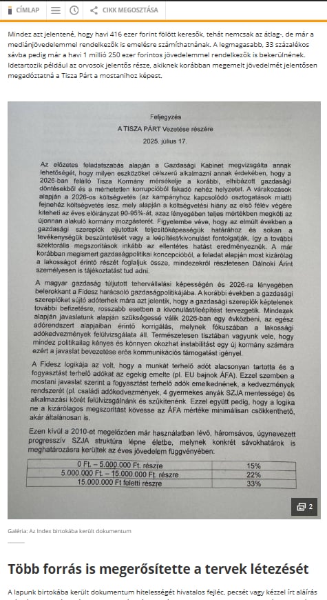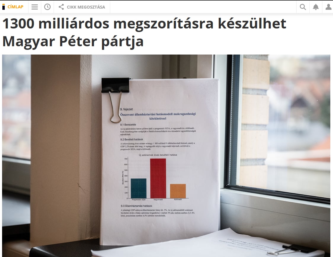 A cikk lényegi állítása szerint a tiszások titokban arra készülnek, hogy durván megemelik a személyi jövedelemadót. Ezt és a dokumentum hitelességét a párt a kezdetek óta tagadja. Magyar Péter még aznap reagált a hírre a Facebookon: írásában harmadikos iskolás szintű hamisítványnak titulálta az Index „birtokába jutott” dokumentumot.