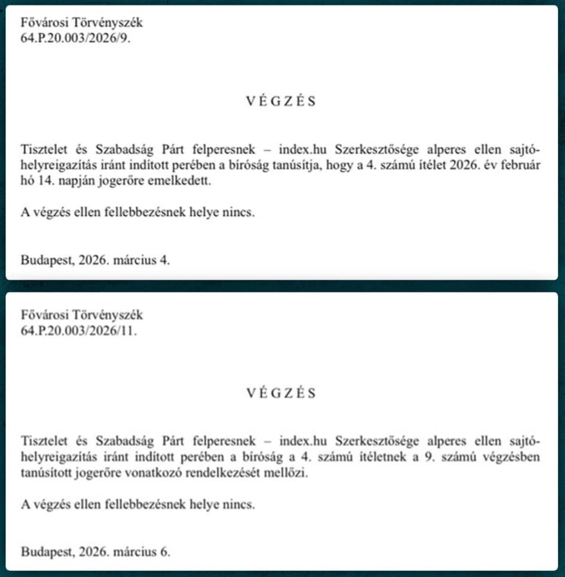 Egy hónap múlva, február 13-án és 17-én két újabb rövid közleménnyel jelentkezett az Index, amelyekben leírták, hogy a bíróság helyreigazításra kötelezte őket a 600 oldalas dokumentum miatt. Ez egybevág a Tisza kommunikációjával, amely szerint a második Index-cikk nyomán indult három per mindegyikben elsőfokon helyreigazításra kötelezték az Indexet. Az Index viszont a két februári ítélet ellen is fellebezett.