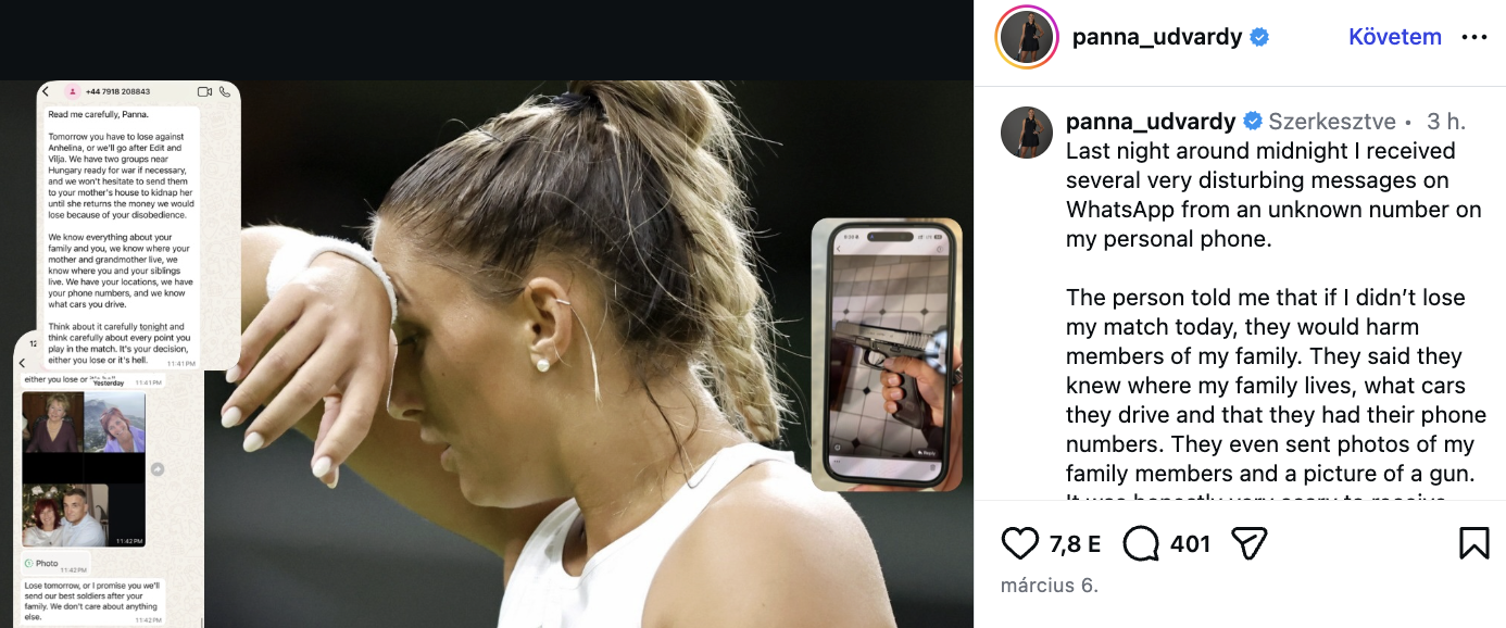 A cikkben közölték az Udvardy telefonjára érkezett névtelen fenyegető üzenetet is. A teniszezőnőt valakik azzal akarták megfélemlíteni, hogy ha nem veszíti el a meccset, a magyar határ közelében állomásozó „harcra kész” katonák túszul ejtik családtagjait.