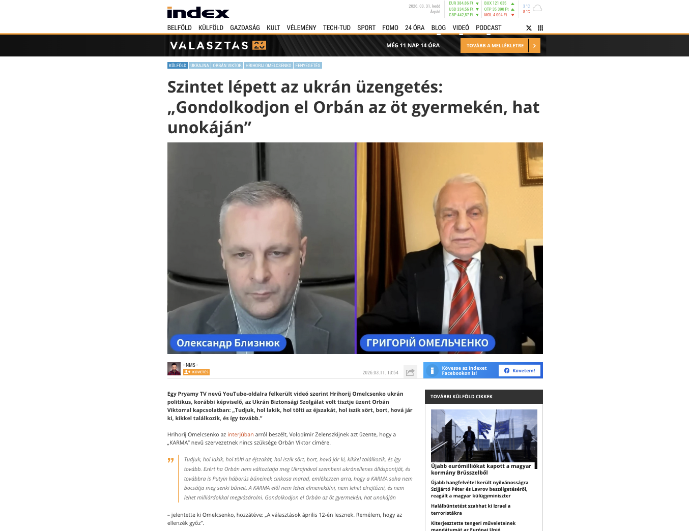 Azt Index emelte be a magyar közbeszédbe március 11-én, hogy Orbán Viktornak és családjának „üzengetett” Hrihorij Omelcsenko ukrán politikus.