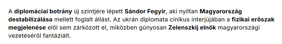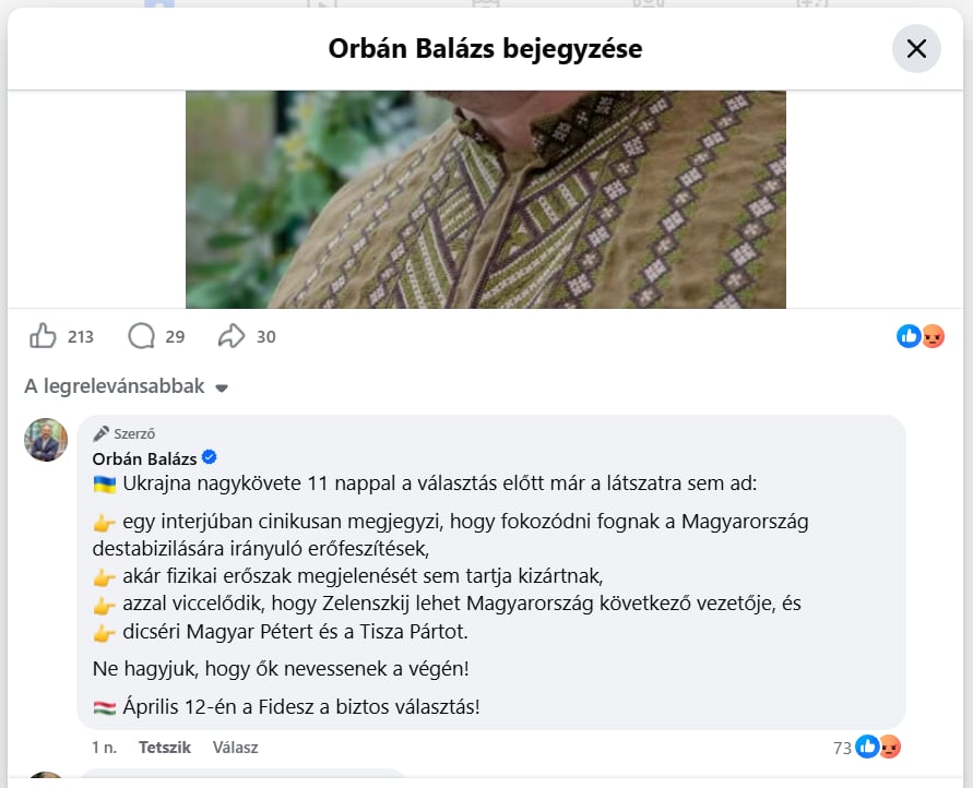 „Ukrajna nagykövete 11 nappal a választás előtt már a látszatra sem ad: egy interjúban cinikusan megjegyzi, hogy fokozódni fognak a Magyarország destabizilására irányuló erőfeszítések, akár fizikai erőszak megjelenését sem tartja kizártnak.”