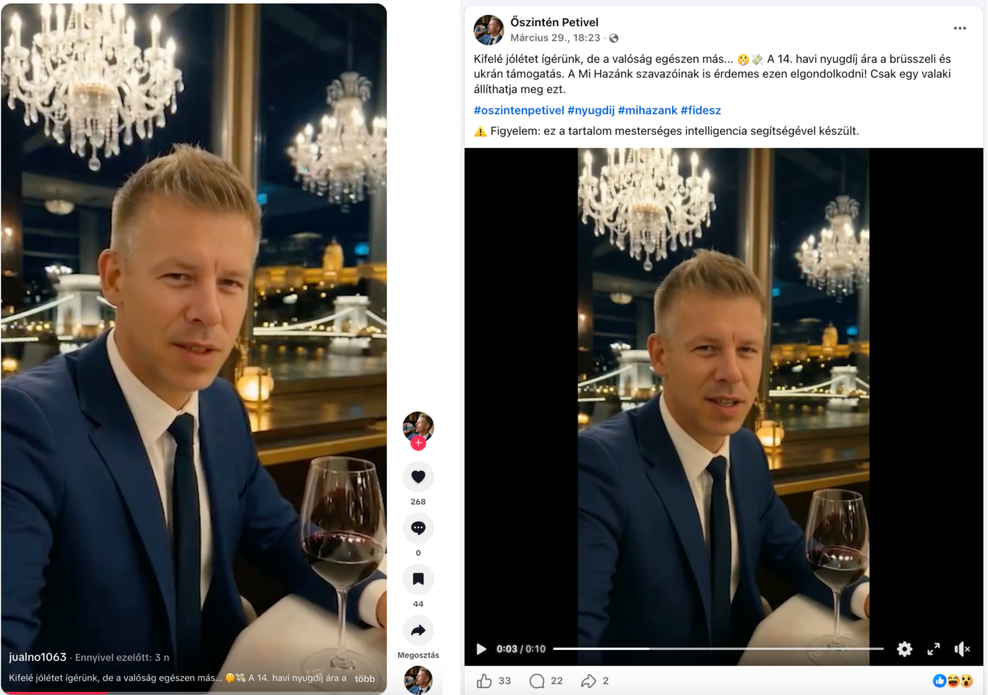 – mondja egy TikTokon és Facebookon is közzétett rövid videóban Magyar Péter AI-generált, egész élethű képmása.