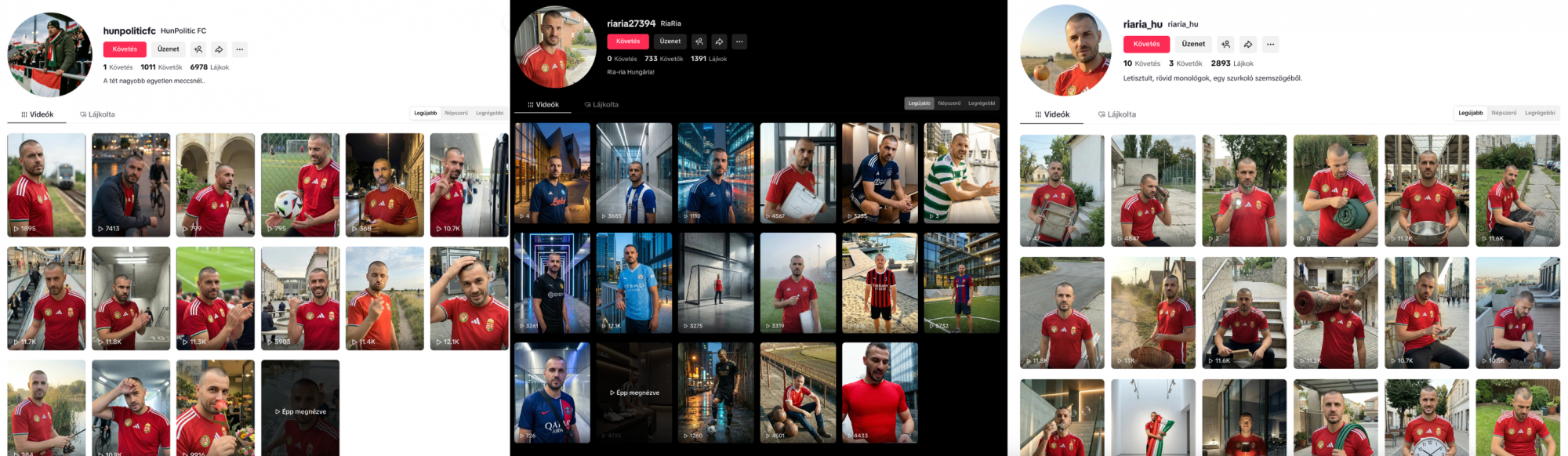 A HunPoliticFC nevű TikTok-oldal például március 12-én kezdett posztolni. A videók főszereplője egy fociultra volt, aki többször a sporttal állította párhuzamba a politikát – természetesen a Fidesz üzenetei mentén. Ez a fiók elérhetetlenné vált (valószínűleg a TikTok törölte), azonban hamar felbukkant egy új változata RiaRia néven, amire március 21-én kezdtek el ugyanolyan fociultrás tartalmakat posztolni. Később ezt is leszedhette a TikTok. A legújabb oldal, a cikkünk megjelenésekor már szintén nem elérhető „riaria_hu” március 28-án kezdett posztolni. Az egyik 11 ezer alkalommal megtekintett videójában azt mondja a csatorna korábbi verzióiból ismert fociultra egy kalitkával a kezében, hogy „Magyar Petinek egy ilyen kalitka elég jó kis lakóhely lenne, elzárva, messze a világtól, hogy egy magyar embernek se tudjon ártani”.