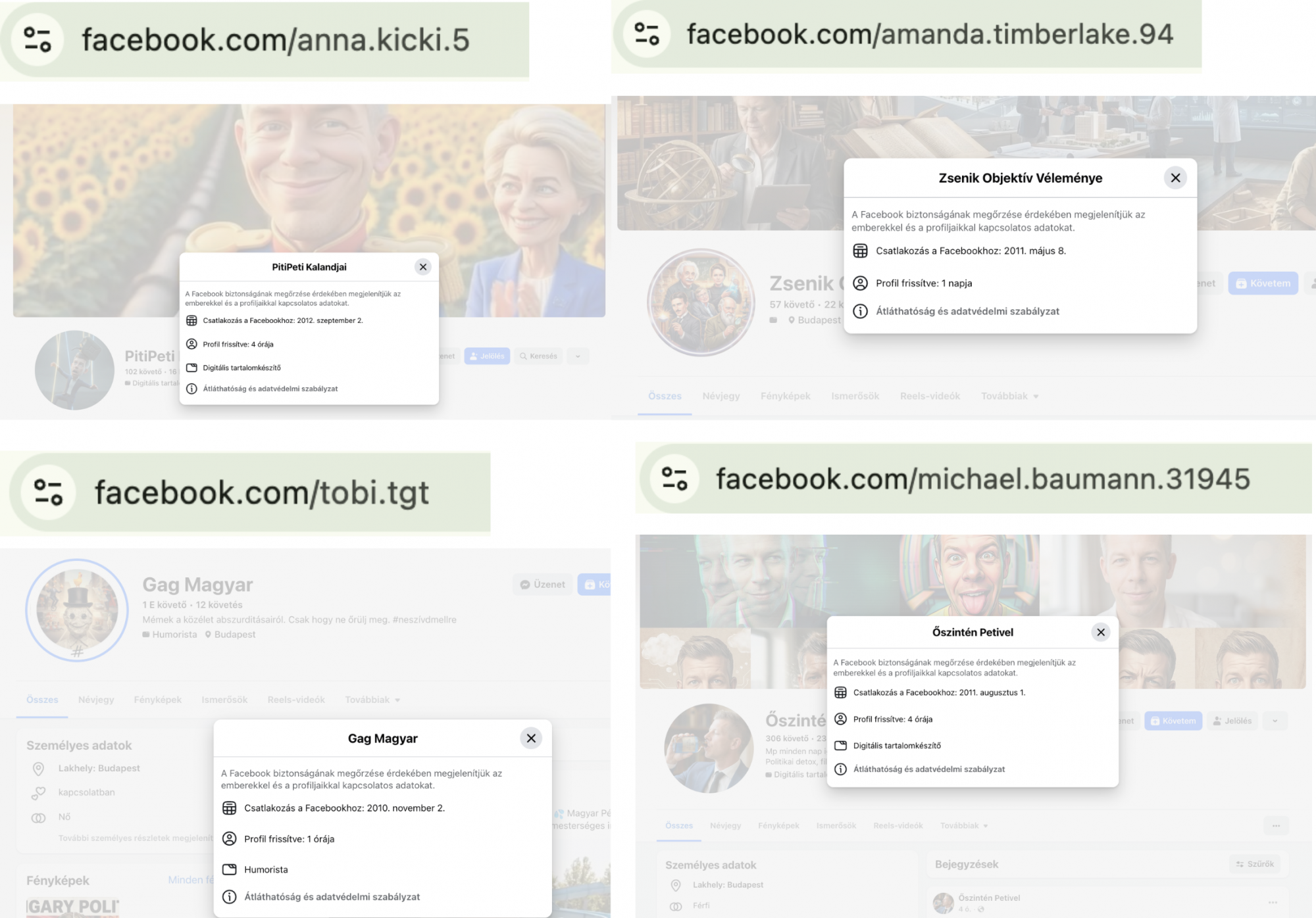 Facebookon nem tapasztaltuk, hogy ilyen intenzitással tűnnének el az oldalak, bár a 444 cikke szerint egy Diana hercegnő AI-mását szerepeltető Facebook-oldalt a cikk írása közben töröltek. A Lakmusz által azonosított 17 Facebook-oldal közül cikkünk megjelenésekor még az összes elérhető. Kilenc oldal márciusban kezdett AI-videókat posztolni, további hat januárban vagy februárban, két oldal pedig már a tavalyi év végén aktív volt.