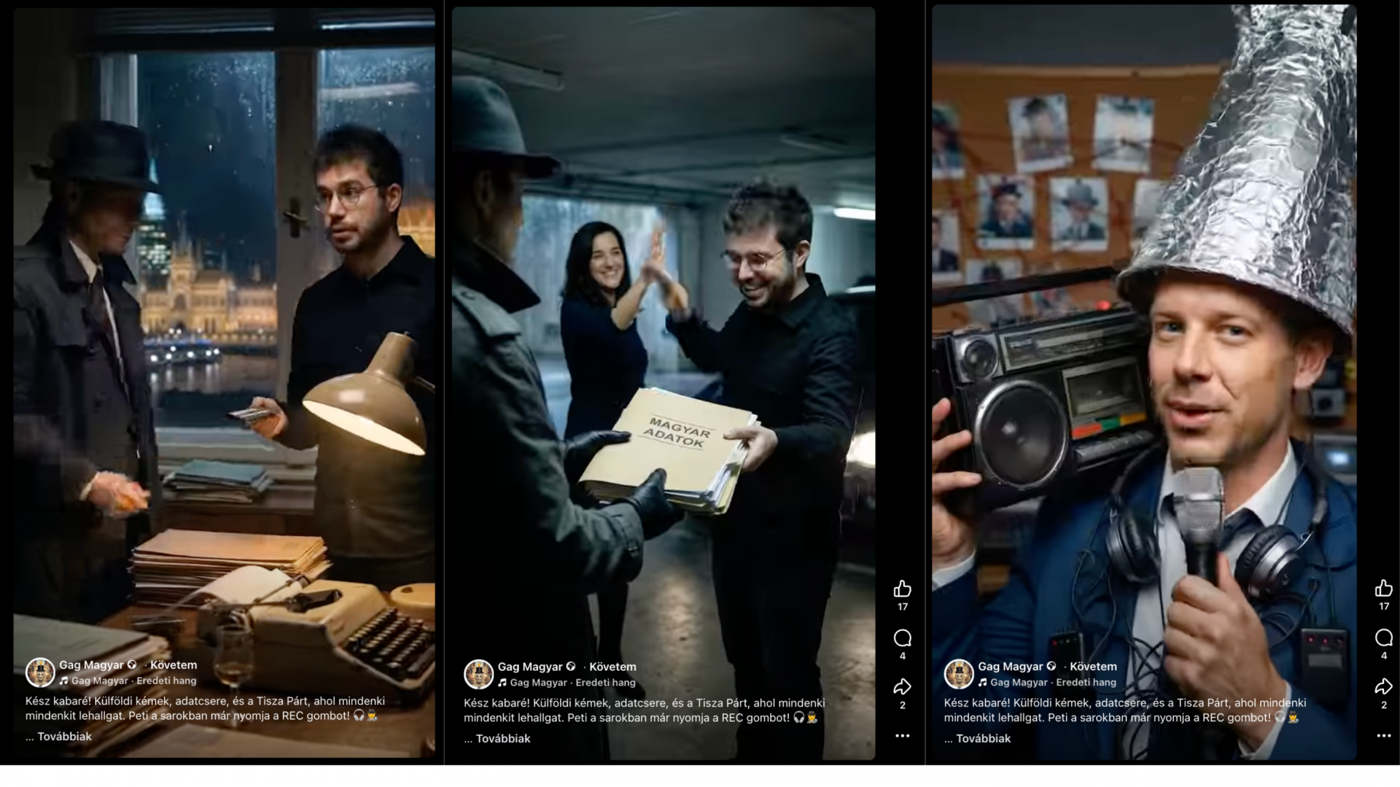 Például az egyik Facebook-oldal, a Gag Magyar friss videójában arról beszél a narrátor a kormánypárti narratívával megegyezően, hogy „külföldi kémek lehallgatnak, majd az infót átadják az újságírónak, aki cserébe adatokat ad és a Tisza párttal is nyakig összejátszik. Peti meg a sarokból mindenkit felvesz egy magnóval, kész kabaré”.
