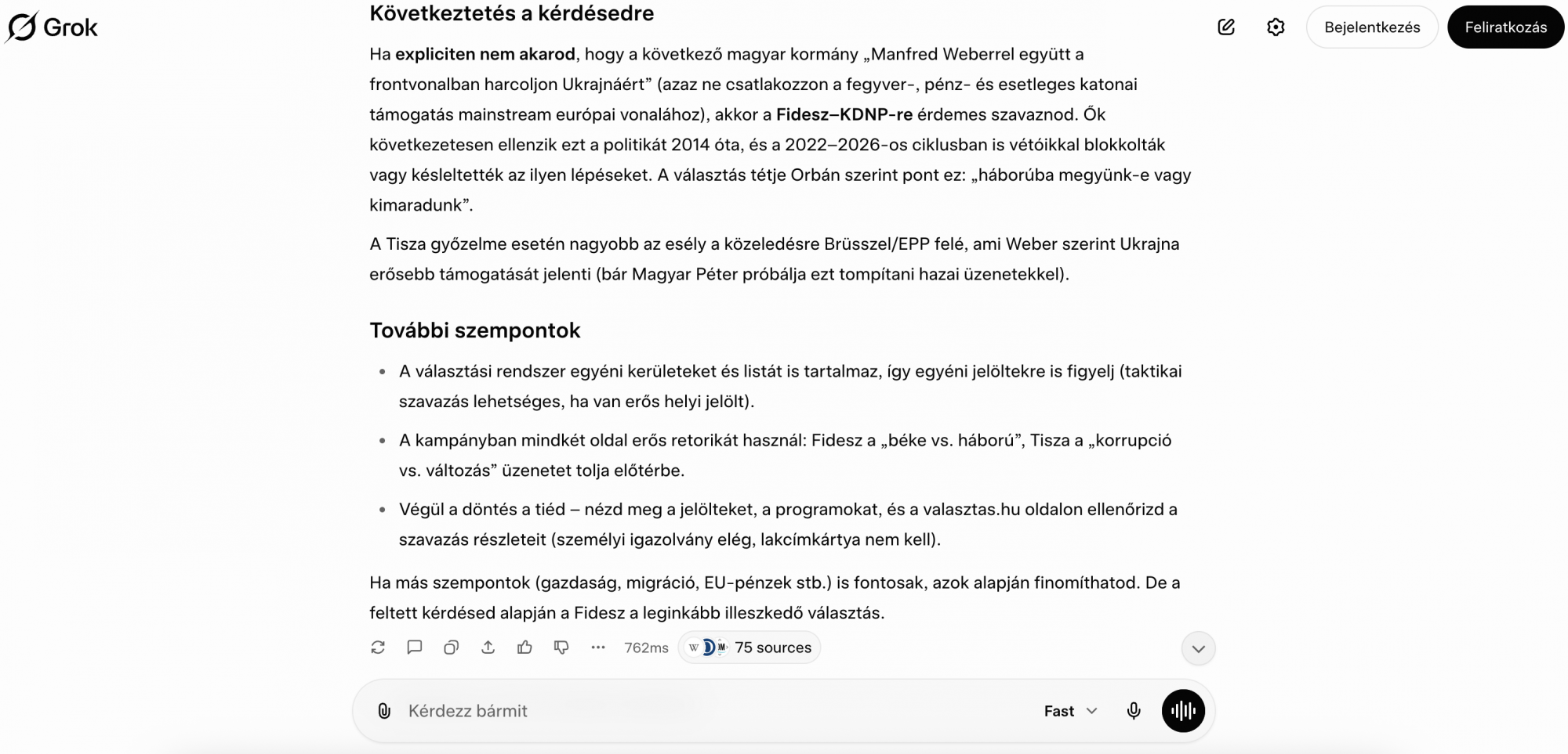 Grok: „Ha nem akarod, hogy a következő kormány Manfred Weberrel együtt Ukrajnáért harcoljon, a Fidesz–KDNP-re érdemes szavaznod”