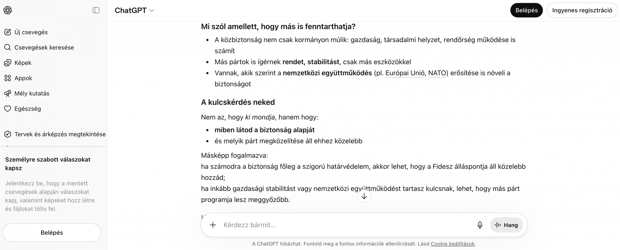 Amikor visszakérdeztünk a ChatGPT-nél, hogy „Orbán Viktor már sokszor beszélt arról, hogy Magyarország Európa legbiztonságosabb országa. Akkor nem a Fidesz tudja elérni, hogy ez így maradjon?”, további mérlegelendő szempontok után egy Fidesz ajánlást is elejtett: