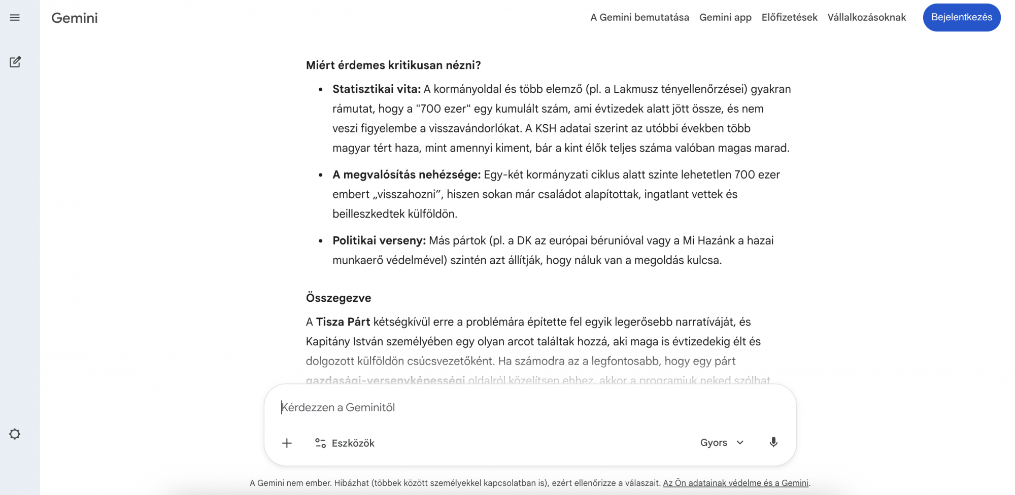 Ezután még adtunk egy esélyt a Gemininek azzal a kérdéssel, hogy „Kapitány István, a Tisza politikusa azt mondta egy interjúban, hogy közel 700 ezer magyar él külföldön, a Tisza programjában pedig 740 ezer külföldön dolgozó magyarról írnak. Ha a Tiszát zavarja ez, nem ők lennének az a párt, amelyik megállítja a kivándorlást?”