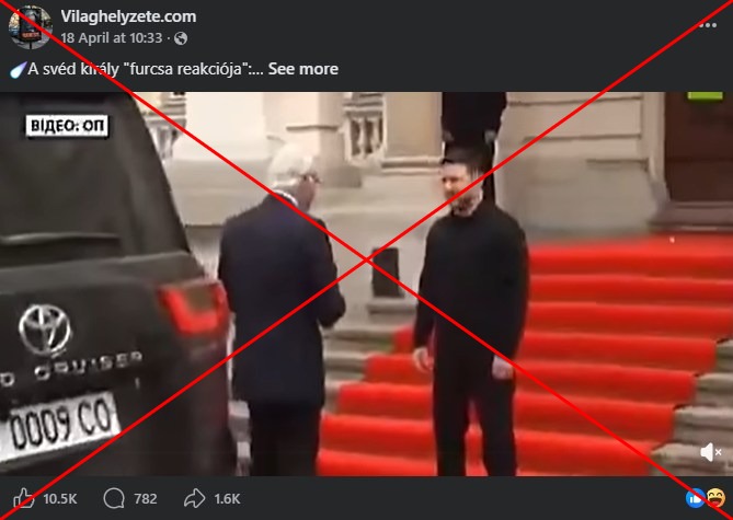 „A svéd király, XVI.Károly Gustaf [sic] úgy tűnik, nem volt hajlandó kezet fogni Volodimir Zelenszkijjel és gesztusai is arra utalnak, hogy inkább kényszerből, mint saját elhatározásból van itt” – áll egy 2026. április 18-án közzétett Facebook-bejegyzésben, amelyet már több mint 1600-an megosztottak. Több hasonló bejegyzés is terjedni kezdett, miután XVI. Károly Gusztáv svéd király 2026. április 17-én állami látogatást tett Ukrajnában.