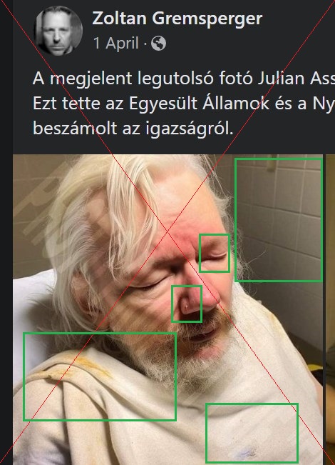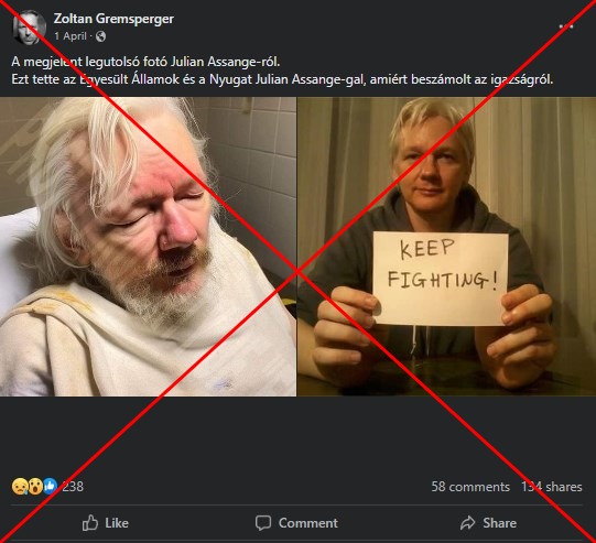 “A megjelent legutolsó fotó Julian Assange-ról. Ezt tette az Egyesült Államok és a Nyugat Julian Assange-gal, amiért beszámolt az igazságról” – olvasható egy magyar Facebook-bejegyzésben, amit 2023. április 1-jei megjelenése óta 134 felhasználó osztott meg.
