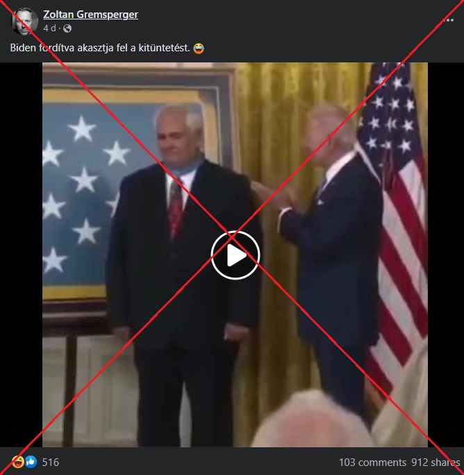 Egy kitüntetési ünnepségről készült magas felbontású felvételen világosan látszik, hogy az Egyesült Államok elnöke, Joe Biden érdemérmet akaszt egy vietnami veterán nyakába, mégpedig úgy, hogy a kitüntetés a veterán mellkasára kerül. Ez cáfolja azokat a Facebook-bejegyzéseket, amelyek az ugyanerről az eseményről készült rossz minőségű videókat felhasználva azt sugallják, hogy az amerikai elnök fordítva tette fel a kitüntetést. A hamis állítást már több mint kétezer alkalommal osztották meg magyarul 2022. július 7-e óta. Az állítás része annak a Magyarországon is népszerű narratívának, ami azt igyekszik bizonyítani, hogy Joe Biden alkalmatlan az elnöki poszt betöltésére.