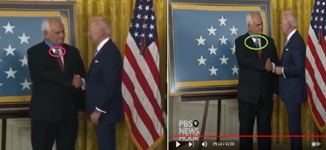 De az ünnepséget élőben közvetítette több amerikai tévécsatorna is, valamint az AFP fotósa is készített képeket az eseményről. A nagy felbontású felvételeken egyértelműen látszik, hogy Joe Biden szabályszerűen tette a veterán nyakába a kitüntetést.