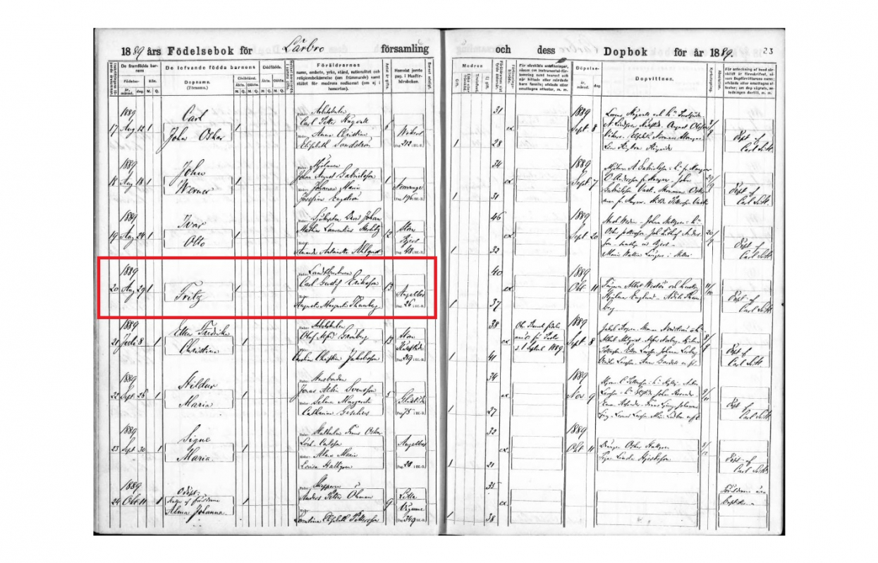 Fritz Thunberg 1889-ben született Gotland megyében – írta Karlsson egy április 16-i e-mailben, rámutatva a Lärbro plébánia anyakönyvében szereplő bejegyzésére (archivált link).